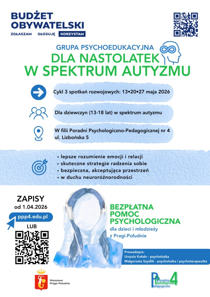 W ramach tego projektu zapraszamy do udziału w zajęciach grupowych: grupa psychoedukacyjna dla nastolatek w spektrum autyzmu. Oferta skierowana jest dla dziewcząt w spektrum autyzmu w wieku 13-18 lat, zamieszkałych lub uczęszczających do placówek na Pradze – Południe m.st. Warszawy. Spotkania mają charakter zajęć grupowych, których celem jest lepsze rozumienie siebie, swoich emocji, potrzeb. Wymiana wspólnych doświadczeń dotyczących relacji i komunikacji, budowanie poczucia bezpieczeństwa i akceptacji siebie, psychoedukacja oparta na podejściu neuroróżnorodności.