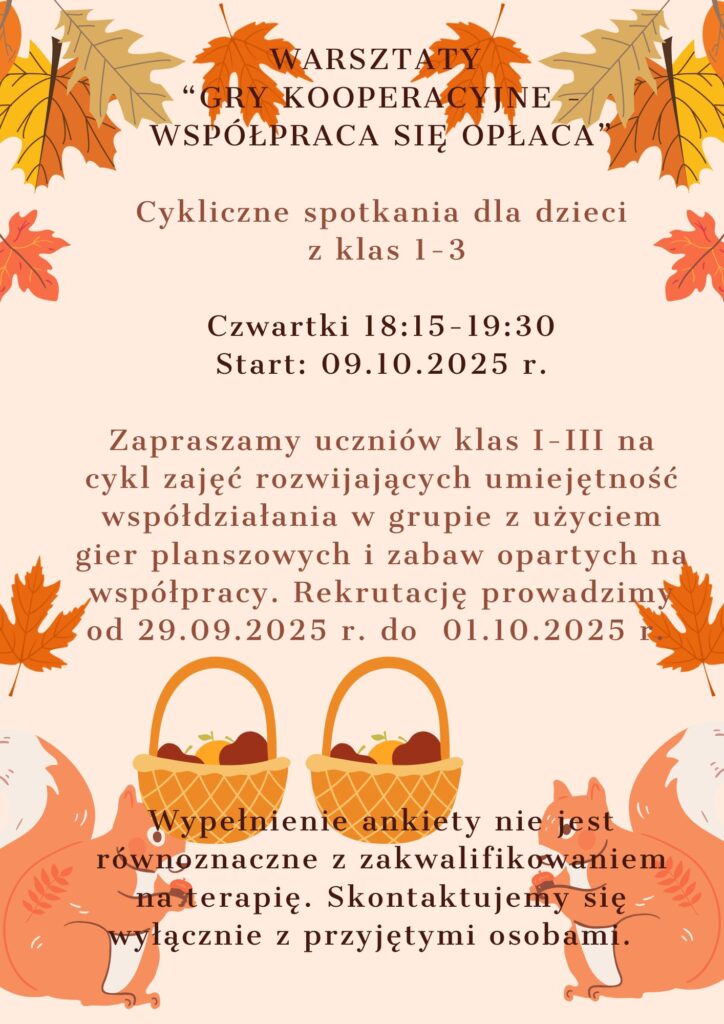 Zapraszamy uczniów klas I-III na cykl zajęć rozwijających umiejętność współdziałania w grupie z użyciem gier planszowych i zabaw opartych na współpracy. Rekrutację prowadzimy od 29.09.2025 r. do dnia 05.10.2025 r.